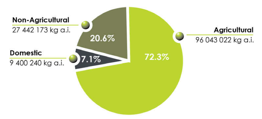 加拿大农药产品按用途分为三类:农用、非农用、家用。2022年,农用产品占总销量的67.4%(图3)、非农用占27.8%、家用占4.7%。与2021年相比,农用产品占比从72.3%降至67.4%,非农用占比从21%升至27.8%,家用占比从7%降至5%(图2)。