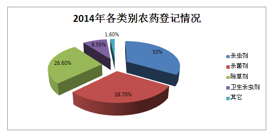从登记的数据看,我国农药登记数量近两年登记的数量稳步保持在3000个以上,今年略有回落。2014年登记产品3374个,同比减少了1.6%。其中,大田用药3085个,同比减少了1.1%;卫生用农药产品有289个,同比减少了7.1%。