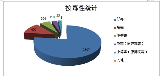 低毒:2597个;微毒:402个;中等毒:204个;低毒(原药高毒):110个;中等毒(原药高毒)53个;其他:8个。