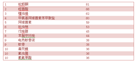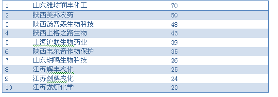 今年登记杀虫剂1102个,占比33%,同比减少8.9%;杀菌剂968个,占比28.7%,同比增加了14.6%;除草剂900个,占比26.6%,同比减少了5.0% ;卫生杀虫剂288个,植物生长调节剂57个,其他59个。杀虫剂仍在总登记证数量中保持首位(33%),呈现高位回落的态势。杀菌剂增速显著,这与今年嘧菌酯产品登记数量最多构成了相互印证。