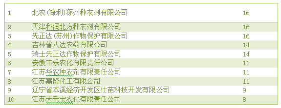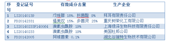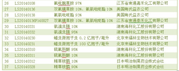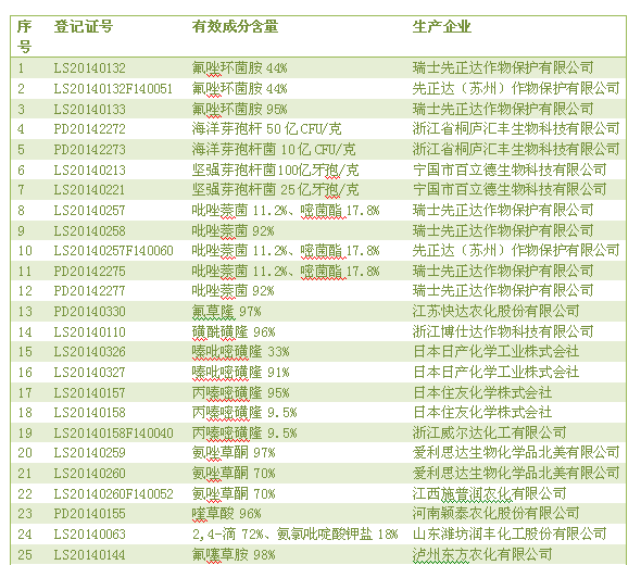 2014年首次登记的有效成分有18种,如氟唑环菌胺、海洋芽孢杆菌、坚强芽孢杆菌、吡唑萘菌胺、氟草隆、磺酰磺隆、嗪吡嘧磺隆、精草铵膦、丙嗪嘧磺隆、氨唑草酮、喹草酸、氨氯吡啶酸加盐、氟噻草胺、氟吡酰草胺、氟氯吡啶酯、氯溴虫腈、蝗虫微孢子虫、硫氟肟醚。