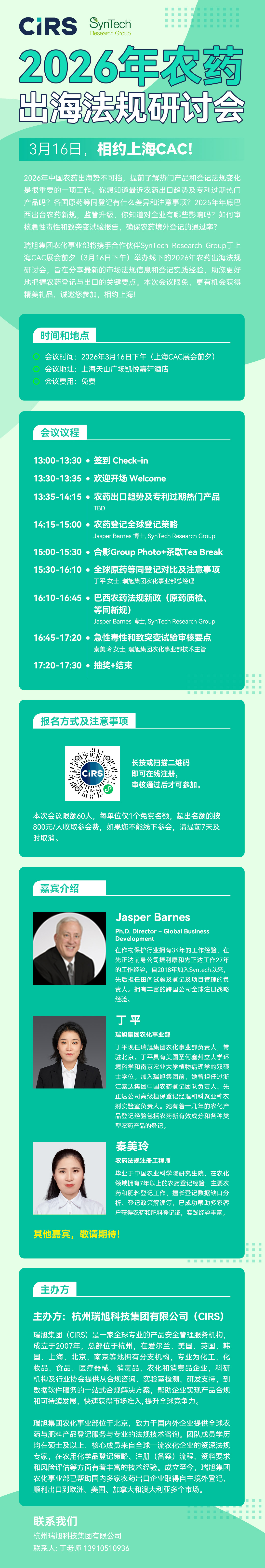 瑞旭集团农化事业部将携手合作伙伴SynTech Research Group于上海CAC展会前夕(3月16日下午)举办线下的2026年农药出海法规研讨会,旨在分享最新的市场法规信息和登记实践经验,助您更好地把握农药登记与出口的关键要点。本次会议限免,更有机会获得精美礼品,诚邀您参加,相约上海!