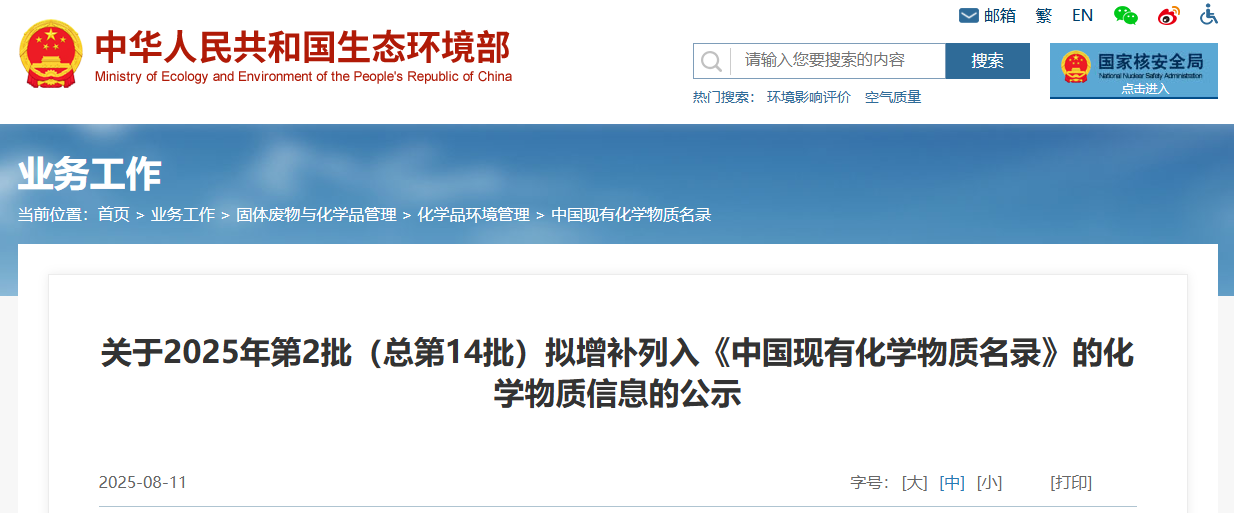 2025年8月11日,生态环境部根据《新化学物质环境管理登记办法》(生态环境部令第12号,以下简称《办法》)和《新化学物质环境管理登记指南》(以下简称《指南》)要求,对相关单位提交的化学物质增补列入《中国现有化学物质名录》(IECSC)的申请材料进行了审核,其中4种化学物质的增补申请材料满足《办法》第三条的规定和《指南》有关要求,拟增补列入《中国现有化学物质名录》,并在官网进行公示。