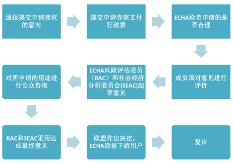 申请授权主要以卷宗形式向ECHA提交材料,卷宗内容包括:物质的鉴定;特定用途描述;化学品安全报告;替代品分析;替代计划;社会-经济分析;认为不构成某种风险的正当理由等。