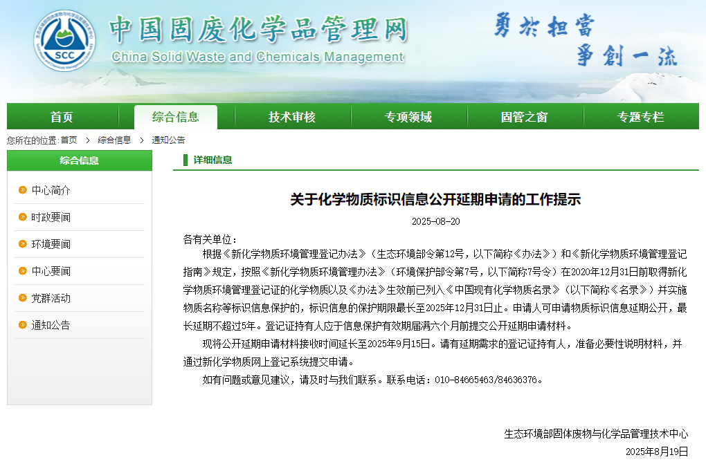 2025年8月19日,生态环境部固体废物与化学品管理技术中心发布了一项关于化学物质标识信息公开延期申请的工作提示。该通知发布了根据《新化学物质环境管理登记办法》(生态环境部令第12号)和《新化学物质环境管理登记指南》的规定,对于已获得环境管理登记证的化学物质标识信息的保护期限延期申请的新安排。