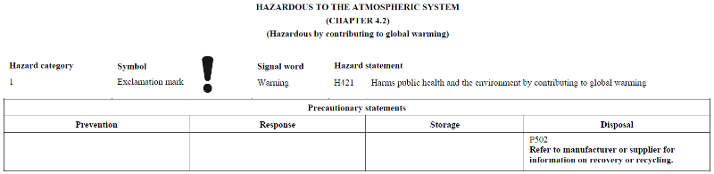 环境危害中“危害臭氧层”类别更名为“危害大气系统”,涵盖因具有臭氧消耗和/或全球升温潜能而对大气系统有害的物质和混合物。这一章中新增“全球变暖危害性”,给出分类标准、标签要素和分类判定逻辑等内容。涉及温室气体相关企业需要特别关注。