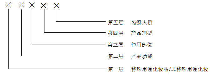 本标准规定了化妆品的分类和编码。其适用于化妆品备案、注册、管理和统计。在特殊用途化妆品、非特殊用途化妆品分类的基础上,按产品功能、作用部位、产品剂型,同时考虑特殊人群,对化妆品进行细化分类。如图一所示,分类编码分五个层次。