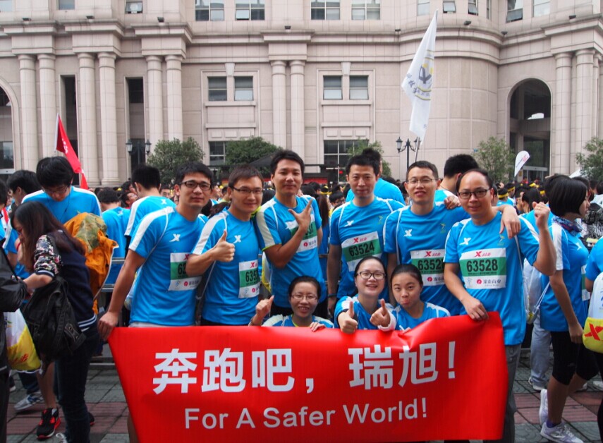 2014年11月2日上午8时,万众期待的2014杭州国际马拉松在黄龙体育中心广场鸣枪开跑。杭州瑞旭产品技术有限公司12名运动员,高举公司旗帜,和3万多名海内外运动员一起,迎着朝阳,体验一把“running man”的感觉。