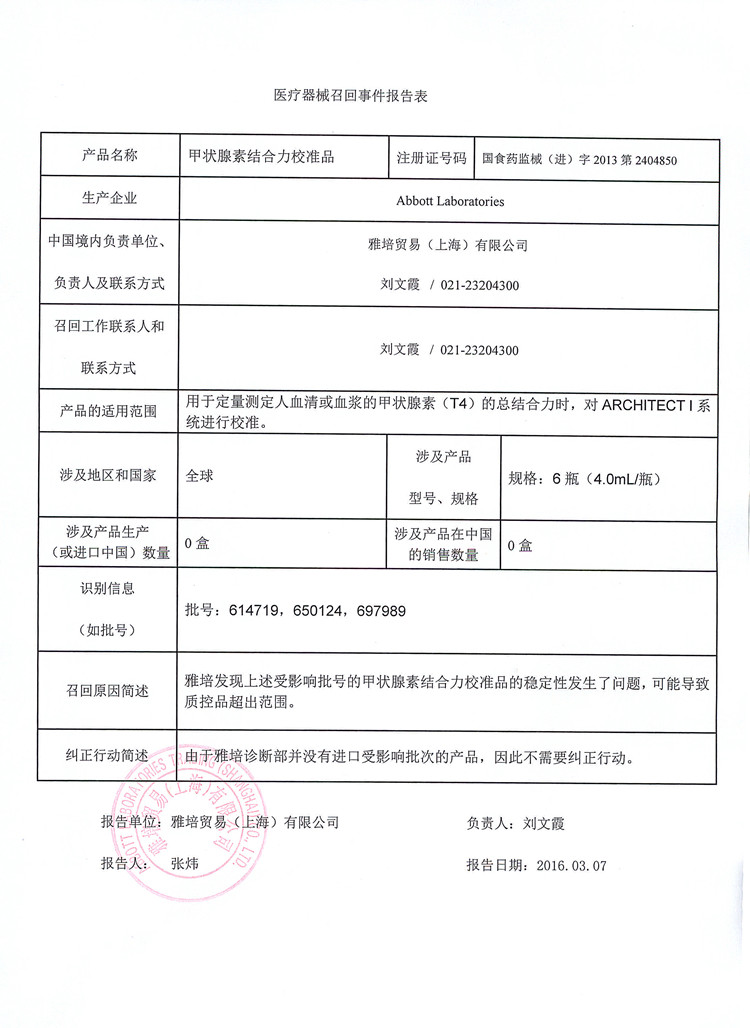 雅培贸易(上海)有限公司报告,该公司代理的甲状腺素结合力校准品(注册证编号:国食药监械(进)字2013第2404850号),由于以上产品的稳定性发生了问题,其生产商Abbott Laboratories对该产品进行主动召回。该公司称本次召回产品未在中国销售。请各省、自治区、直辖市食品药品监督管理局加强对此类产品的监督管理。