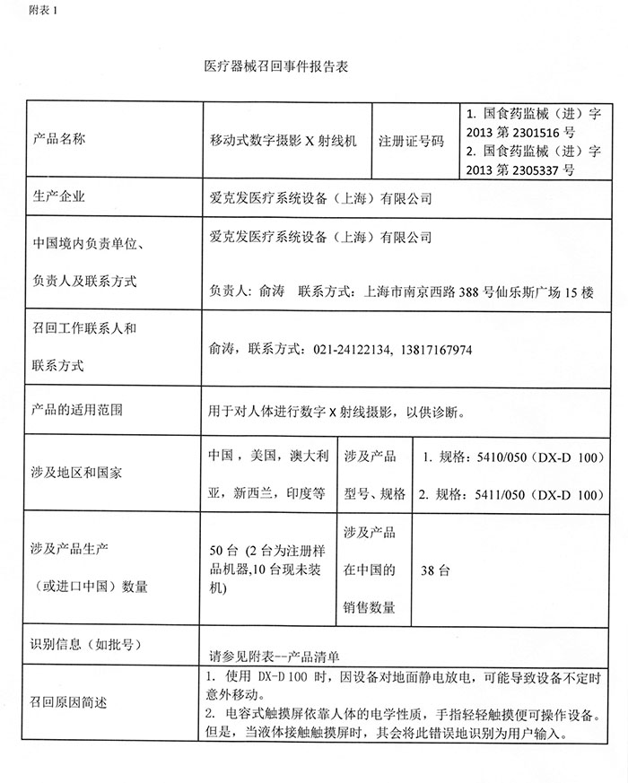 爱克发医疗系统设备(上海)有限公司对移动式数字摄影X射线机主动召回
