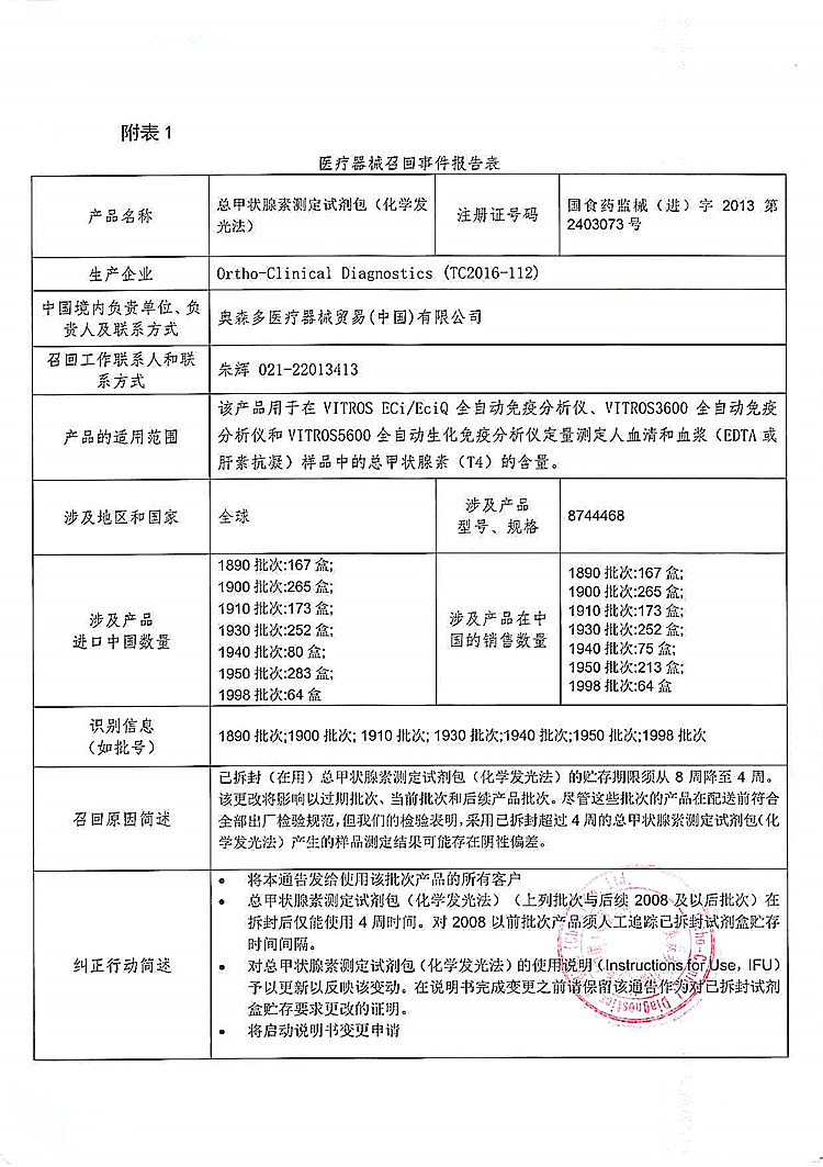 奥森多医疗器械贸易(中国)有限公司对总甲状腺素测定试剂包(化学发光法)主动召回