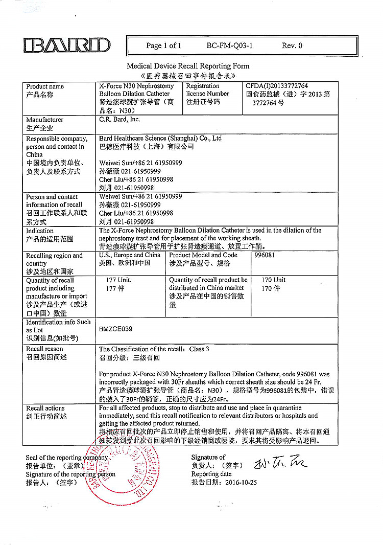 巴德医疗科技(上海)有限公司报告:规格型号为996081的包装中,错误的装入了30Fr的鞘管。公司主动召回相关产品,召回级别为III级。涉及产品的型号、规格及批次等详细信息见《医疗器械召回事件报告表》。