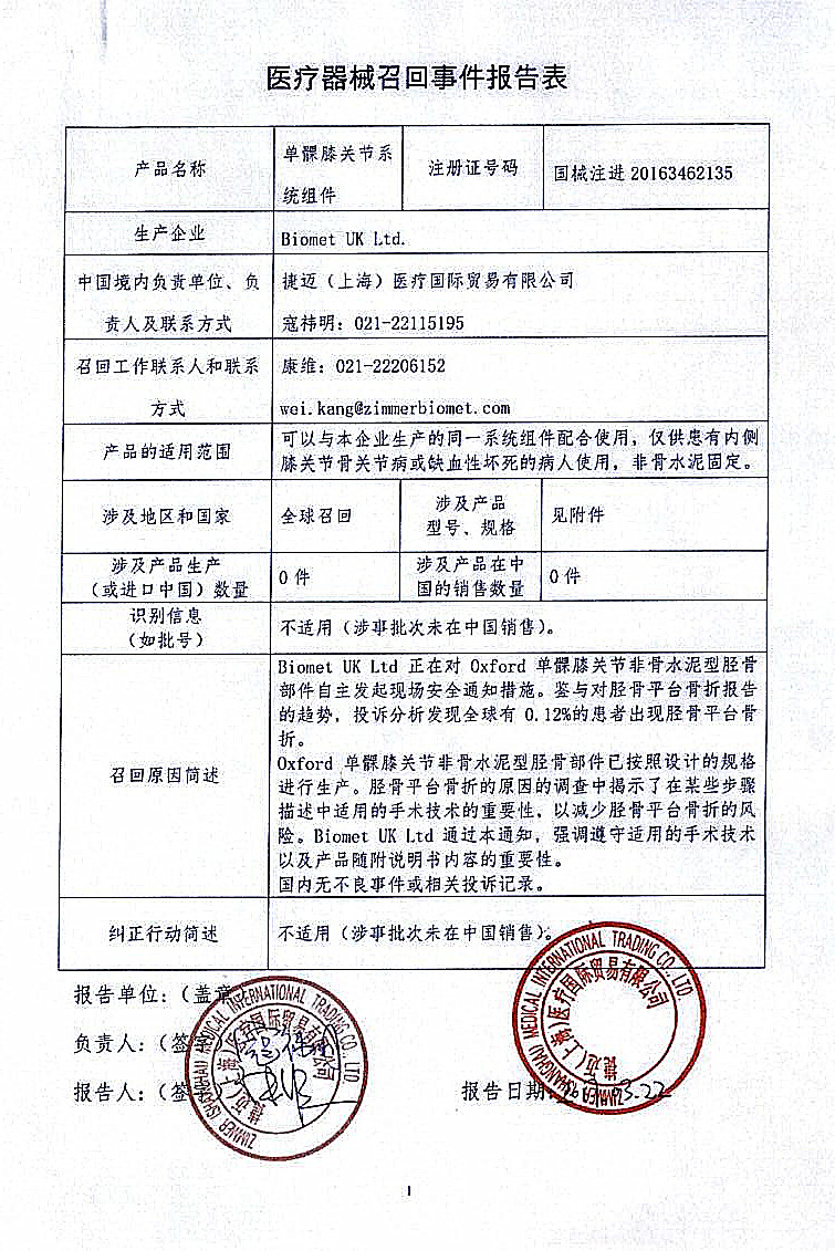 捷迈(上海)医疗国际贸易有限公司报告,该公司代理的单髁膝关节系统组件(注册证编号:国械注进20163462135),Oxford单髁膝关节非骨水泥型胫骨部件可能会导致患者出现胫骨平台骨折的情况。其生产商Biomet UK LTD.对该产品进行主动召回,该公司声称本次召回产品未在中国销售。请各省、自治区、直辖市食品药品监督管理局加强对此类产品的监督管理。