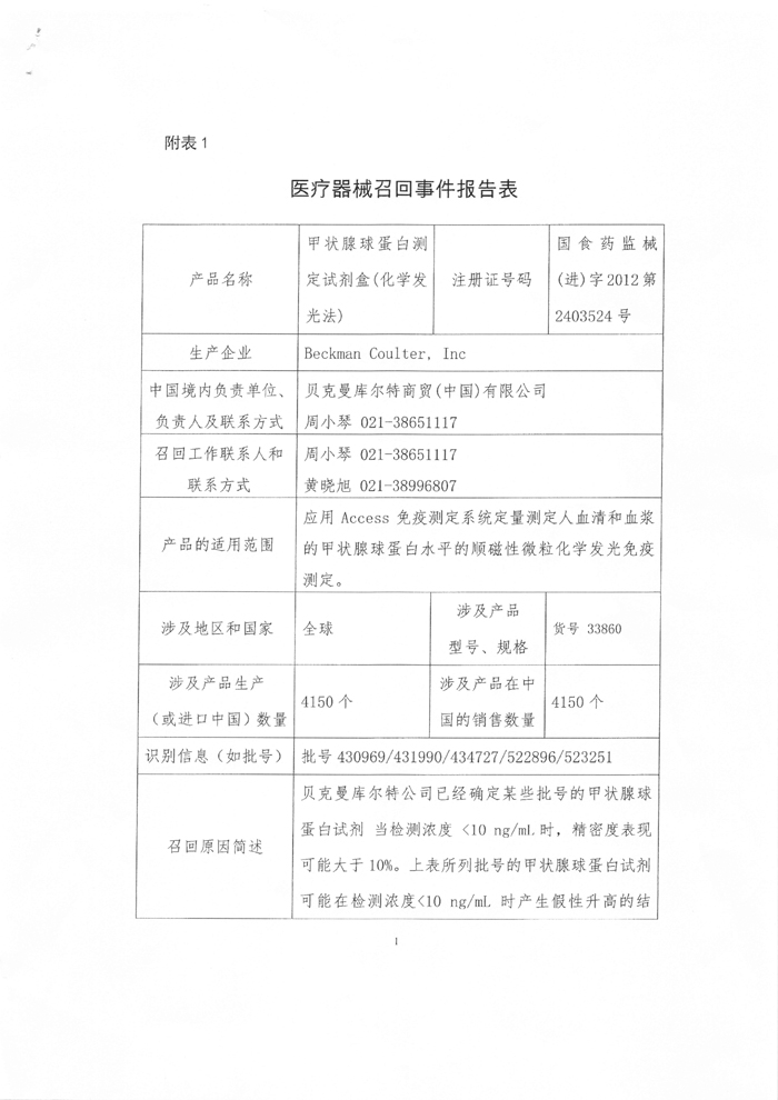贝克曼库尔特商贸(中国)有限公司报告: 公司确定特定批号产品,当检测浓度小于10ng/ml时,精密度表现可能大于10%,产生假性升高结果。公司主动召回相关产品,召回级别III级。涉及产品的型号、规格及批次等详细信息见《医疗器械召回事件报告表》。