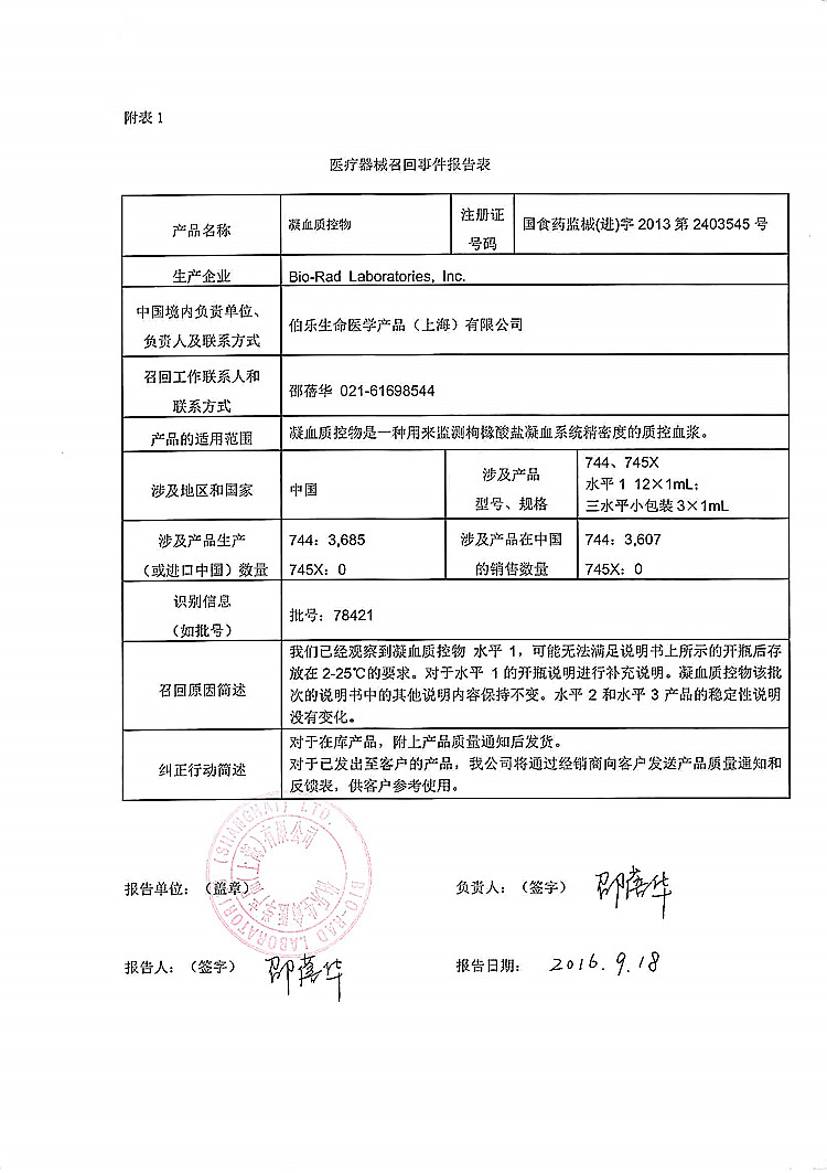 伯乐生命医学产品(上海)有限公司对凝血质控物主动召回