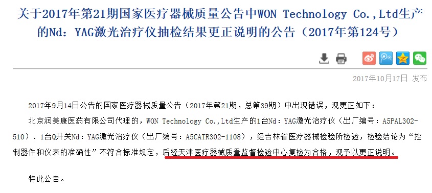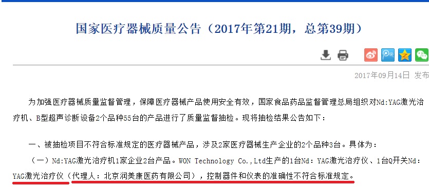2017年9月14日发布的国家医疗器械质量公告(2017年第21期,总第39期)中被抽检项目不符合标准规定的产品第一个就是北京润美医药有限公司代理YAG激光治疗仪。