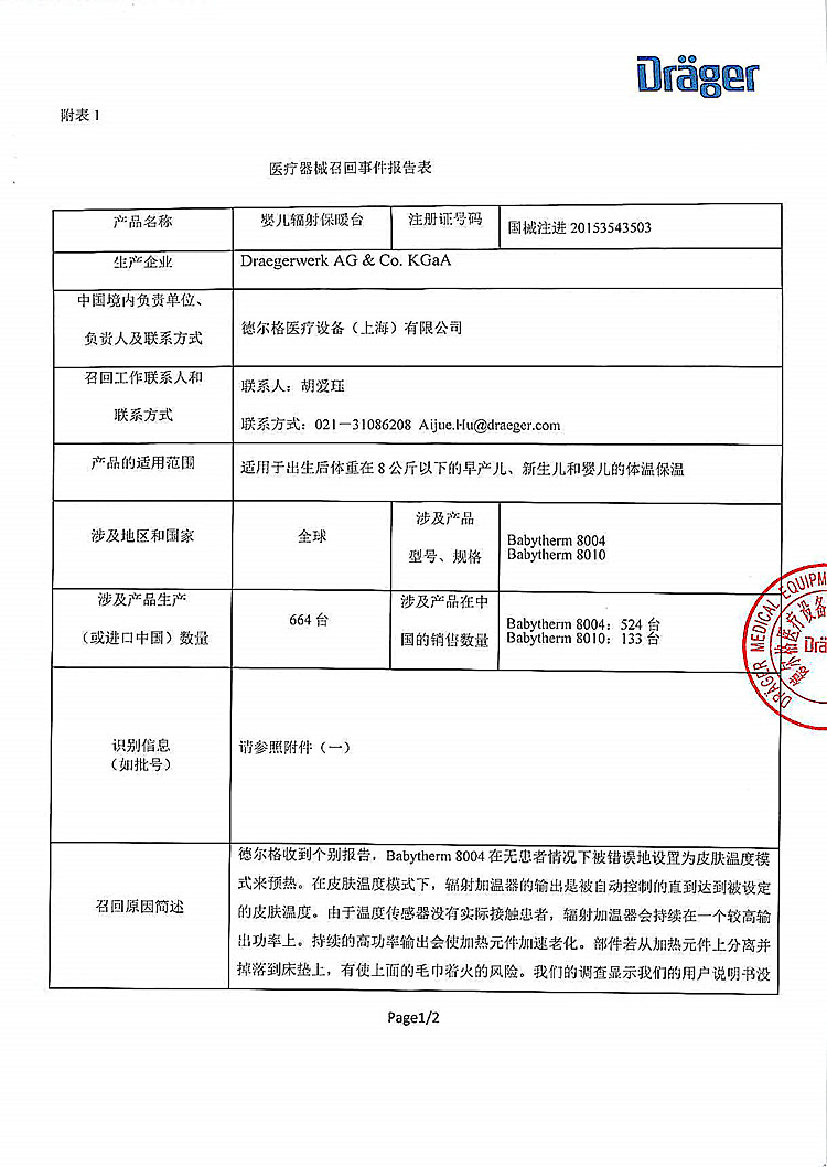 德尔格医疗设备(上海)有限公司对婴儿辐射保暖台主动召回
