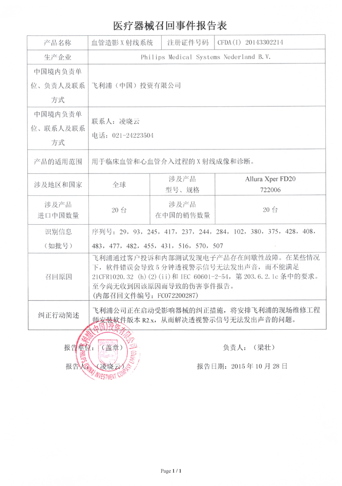 飞利浦(中国)投资有限公司对血管造影X射线系统主动召回