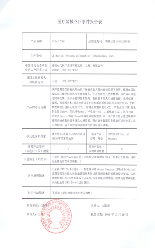 通用电气医疗系统贸易发展(上海)有限公司报告,该公司代理的中心工作站(注册证编号:国械注进20142215843),由于以上产品的记录器阻燃和放进液等级未能达到预期设计要求,其生产商GE Medical Systems Information Technologies, Inc.对该产品进行主动召回。该公司称本次召回产品未在中国销售。请各省、自治区、直辖市食品药品监督管理局加强对此类产品的监督管理。