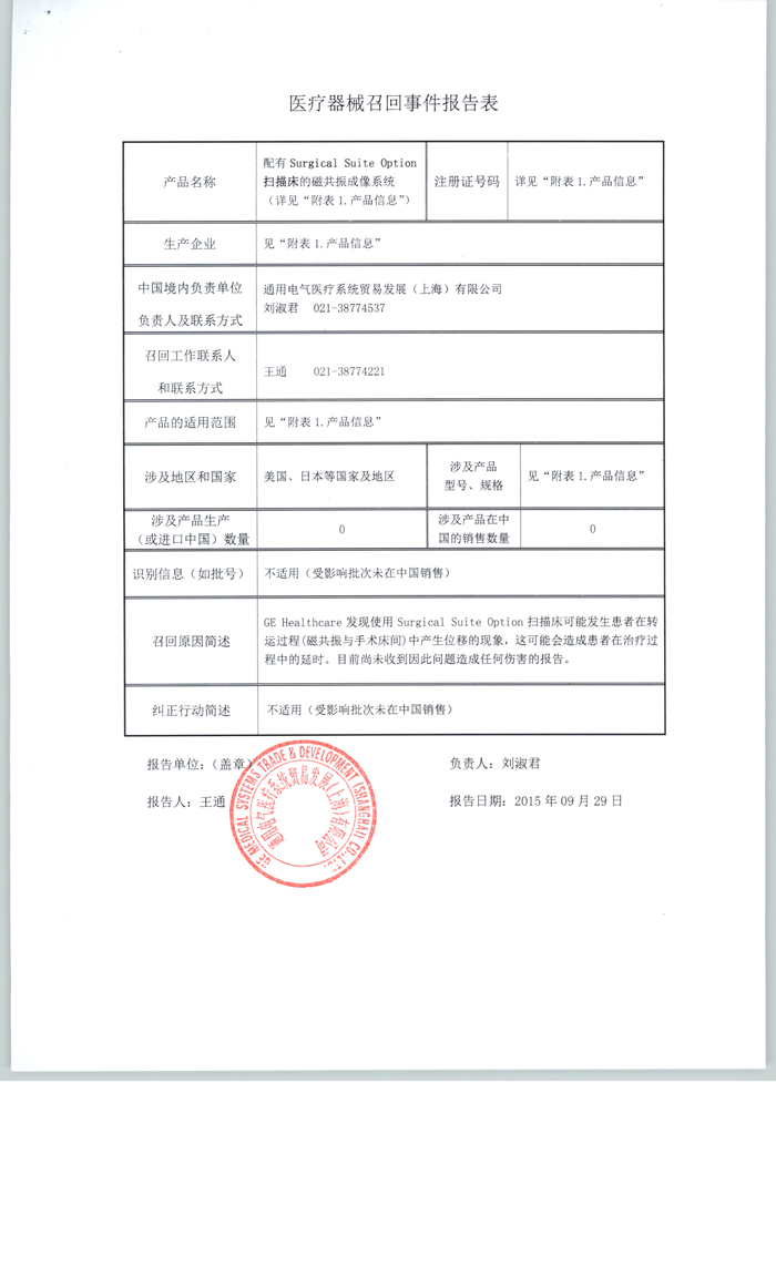 通用电气医疗系统贸易发展(上海)有限公司报告,该公司代理的磁共振成像系统 (注册证号码详见召回事件报告表),由于以上产品使用时在转运过程中可能产生位移现象,其生产商GE Medical Systems, LLC等对该产品进行主动召回。该公司称本次召回产品未在中国销售。请各省、自治区、直辖市食品药品监督管理局加强对此类产品的监督管理。