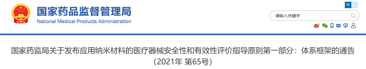 为加强医疗器械产品注册工作的监督和指导,进一步提高注册审查质量,国家药品监督管理局组织制定了《应用纳米材料的医疗器械安全性和有效性评价指导原则第一部分:体系框架》,现予发布。