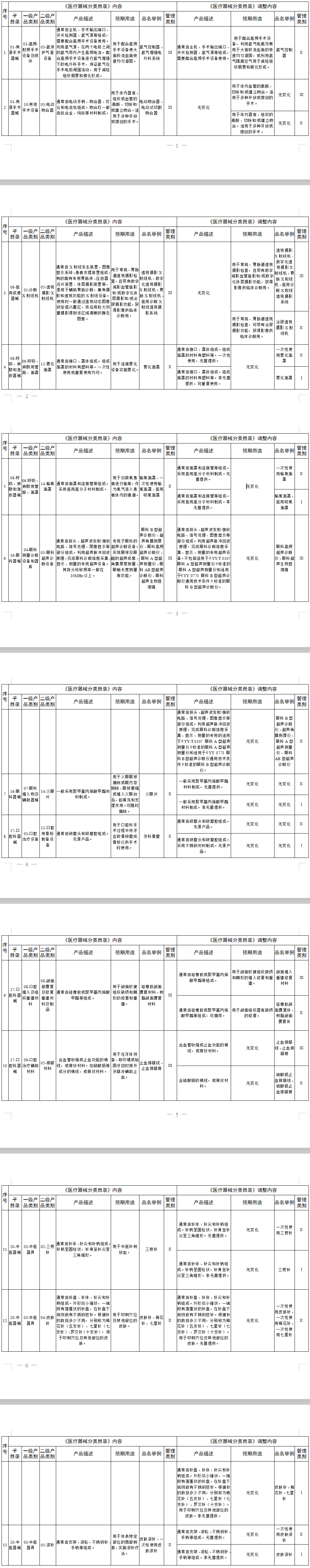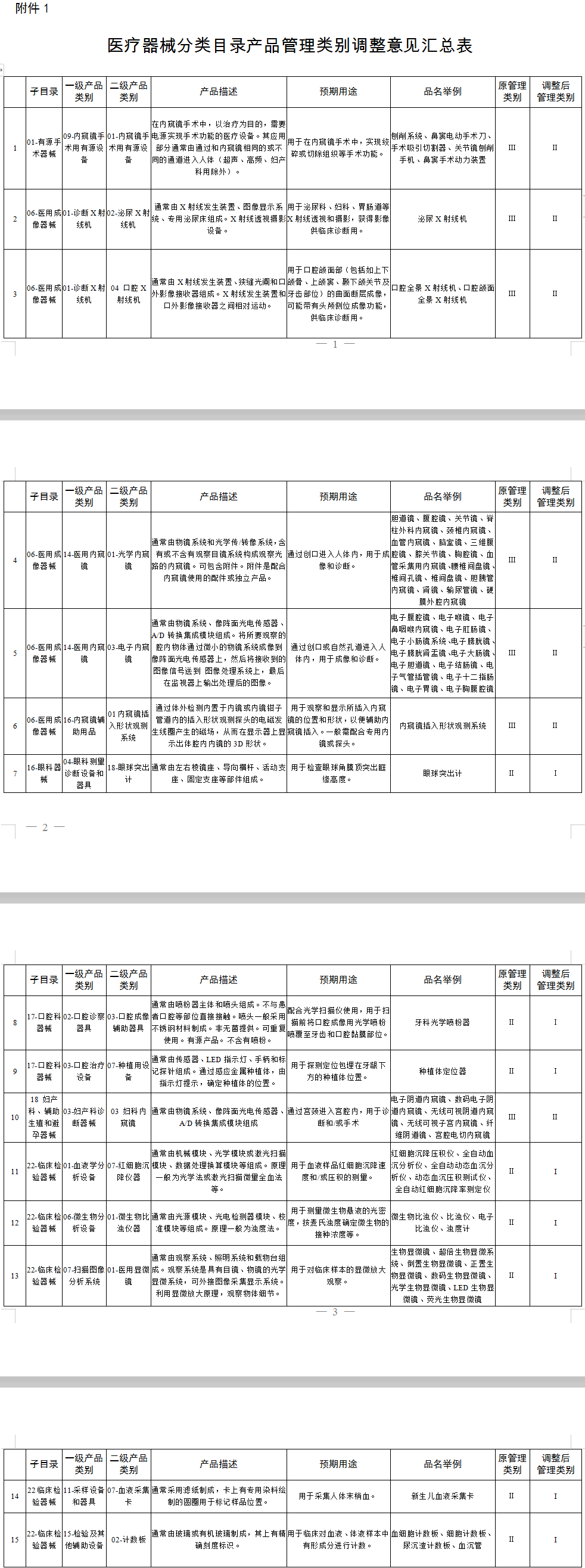 附件1 医疗器械分类目录产品管理类别调整意见汇总表