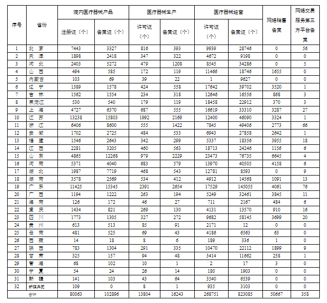 为进一步满足企业公众查询医疗器械监管信息的需要,强化社会监督与社会共治,国家药监局汇总了各省有效期内医疗器械产品注册备案、医疗器械生产企业许可备案、医疗器械经营企业许可备案、医疗器械网络销售备案、医疗器械网络交易服务第三方平台备案信息(附后),现按月公布。具体数据可点击国家药监局数据查询页面医疗器械模块查询(http://app1.nmpa.gov.cn/data_nmpa/face3/dir.html?type=ylqx)。如对数据有疑问,请按网站数据库公布的纠错维护方式操作。