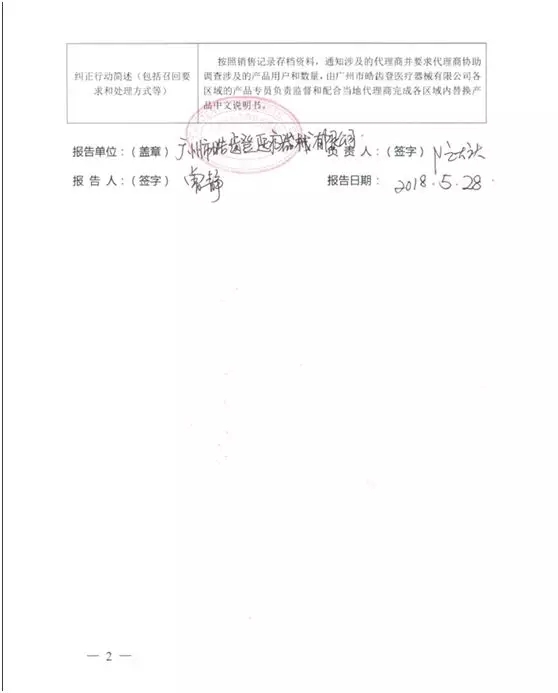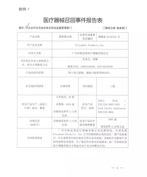 广州市皓齿登医疗器械有限公司报告,其代理的菌斑指示剂在进行第一类医疗器械备案后,中文说明书中的注册证编号等信息未更新,广州市皓齿登医疗器械有限公司对菌斑指示剂(备案号:国械备20160741号)主动召回。召回级别为三级。涉及产品的型号、规格及批次等详细信息见