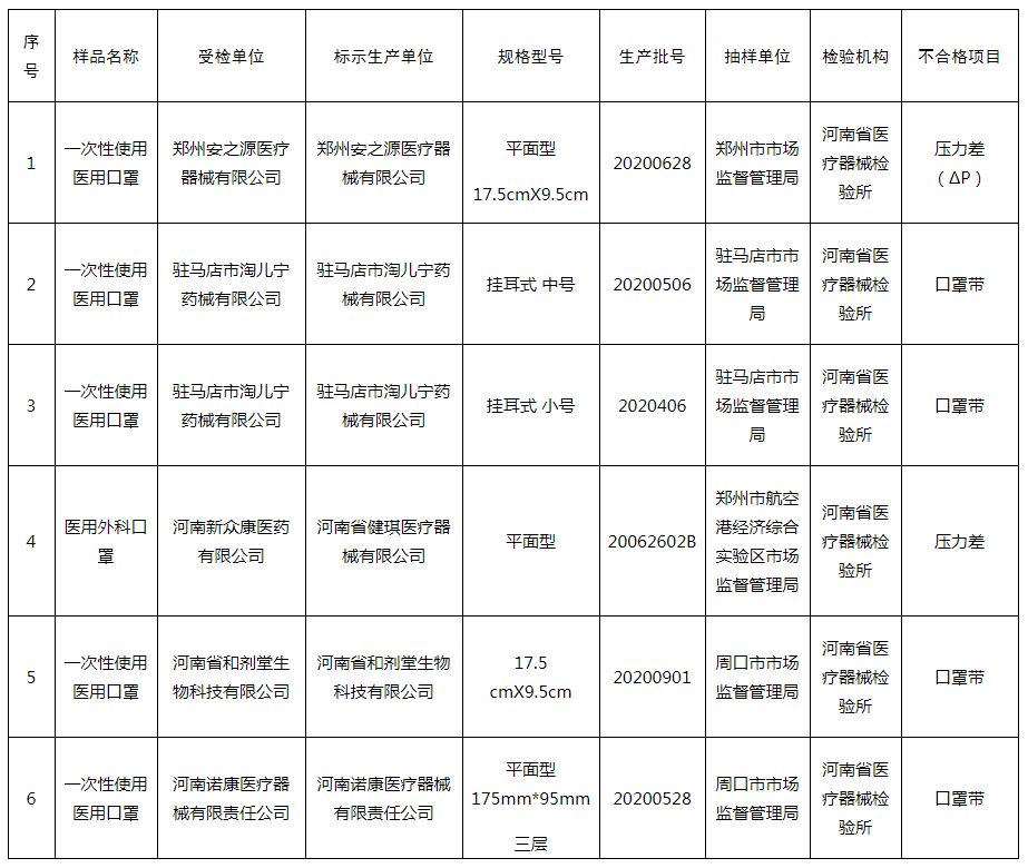 1.郑州安之源医疗器械有限公司生产的1批次医用外科口罩,规格型号:平面型17.5cmX9.5cm,生产日期:2020年6月28日,生产批号:20200628,不合格项目:压力差(ΔΡ)。