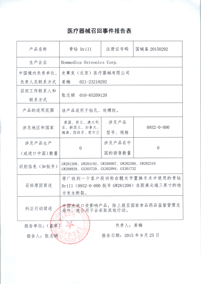 史赛克(北京)医疗器械有限公司报告,该公司代理的骨钻 Drill (备案号:国械备20150202),由于以上产品发生断裂投诉,其生产商Howmedica Osteonics Corp.对该产品进行主动召回。该公司称本次召回产品未在中国销售。请各省、自治区、直辖市食品药品监督管理局加强对此类产品的监督管理。