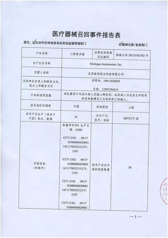 北京极远恒生科技有限公司 报告,由于 可能出现调节旋钮最初的5圈按压深度没有变化,但在最后1/2-1/4圈时,按压深度针阀(CDNV)可能按压8cm整个深度等原因。 Michigan Instruments, Inc.对其生产的心肺复苏器(注册或备案号:国械注进20153542782号)主动召回。召回级别为 三级 。涉及产品的型号、规格及批次等详细信息见《医疗器械召回事件报告表》。