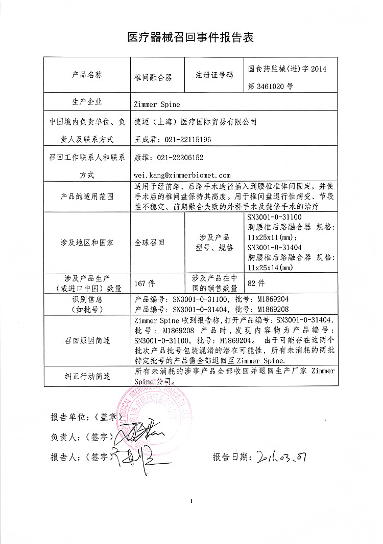 捷迈(上海)医疗国际贸易有限公司对椎间融合器主动召回