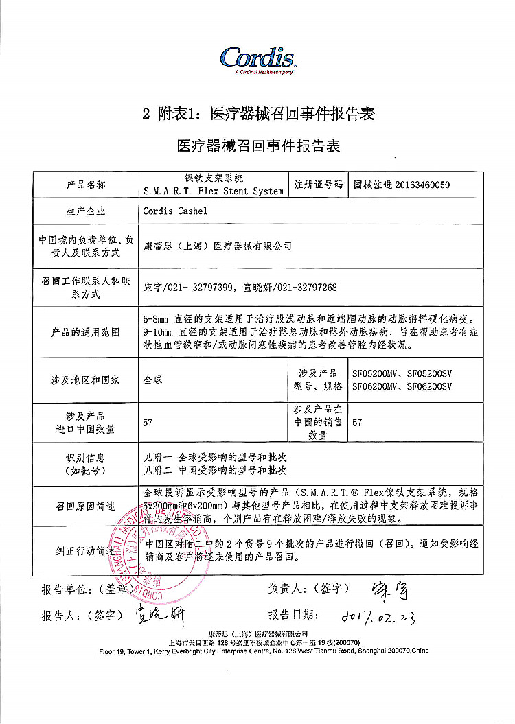 康蒂思(上海)医疗器械有限公司对镍钛支架系统主动召回