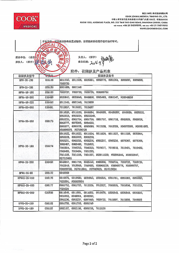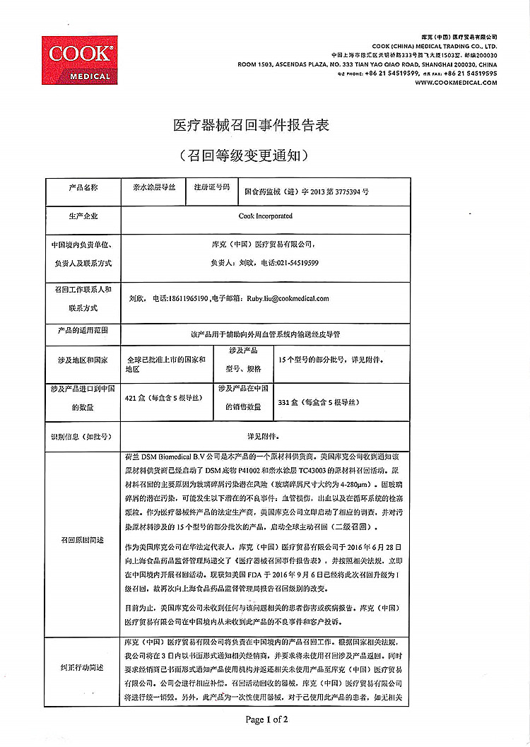 库克(中国)医疗贸易有限公司报告:公司将亲水涂层导丝召回等级由二级升级为一级,涉及产品的型号、规格及批次等详细信息见《医疗器械召回事件报告表》。