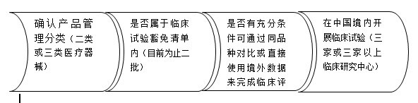| 免于进行临床实验 | 免于进行临床实验,申报注册时予以说明,并提交相关证明资料 | 相关证明资料+临床试验 | 进行临床试验 | 经审批方可进行临床试验 | |