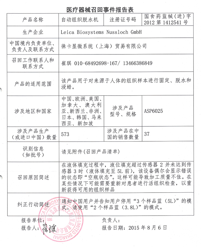 徕卡显微系统(上海)贸易有限公司对自动组织脱水机主动召回