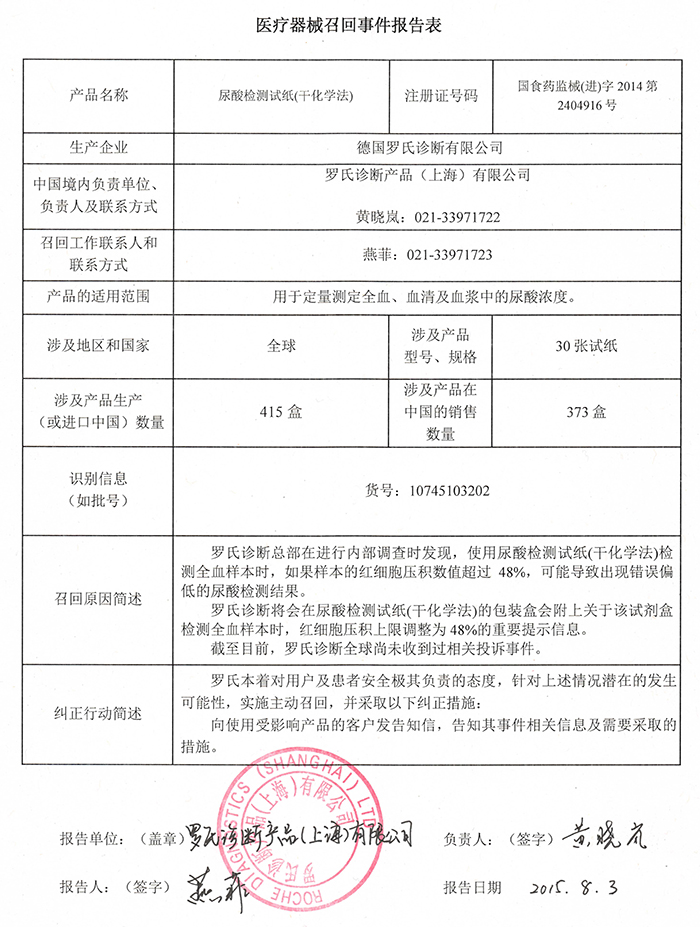 罗氏诊断产品(上海)有限公司对尿酸检测试纸(干化学法)产品主动召回
