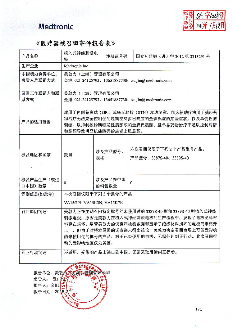 美敦力(上海)管理有限公司报告,该公司代理的植入式神经刺激电极(注册证编号:国食药监械(进)字2012第3213291号),由于在生产流程中发现了电极绝缘材料存在损坏,其生产商Medtronic Inc.对该产品进行主动召回。该公司称本次召回产品未在中国销售。请各省、自治区、直辖市食品药品监督管理局加强对此类产品的监督管理。