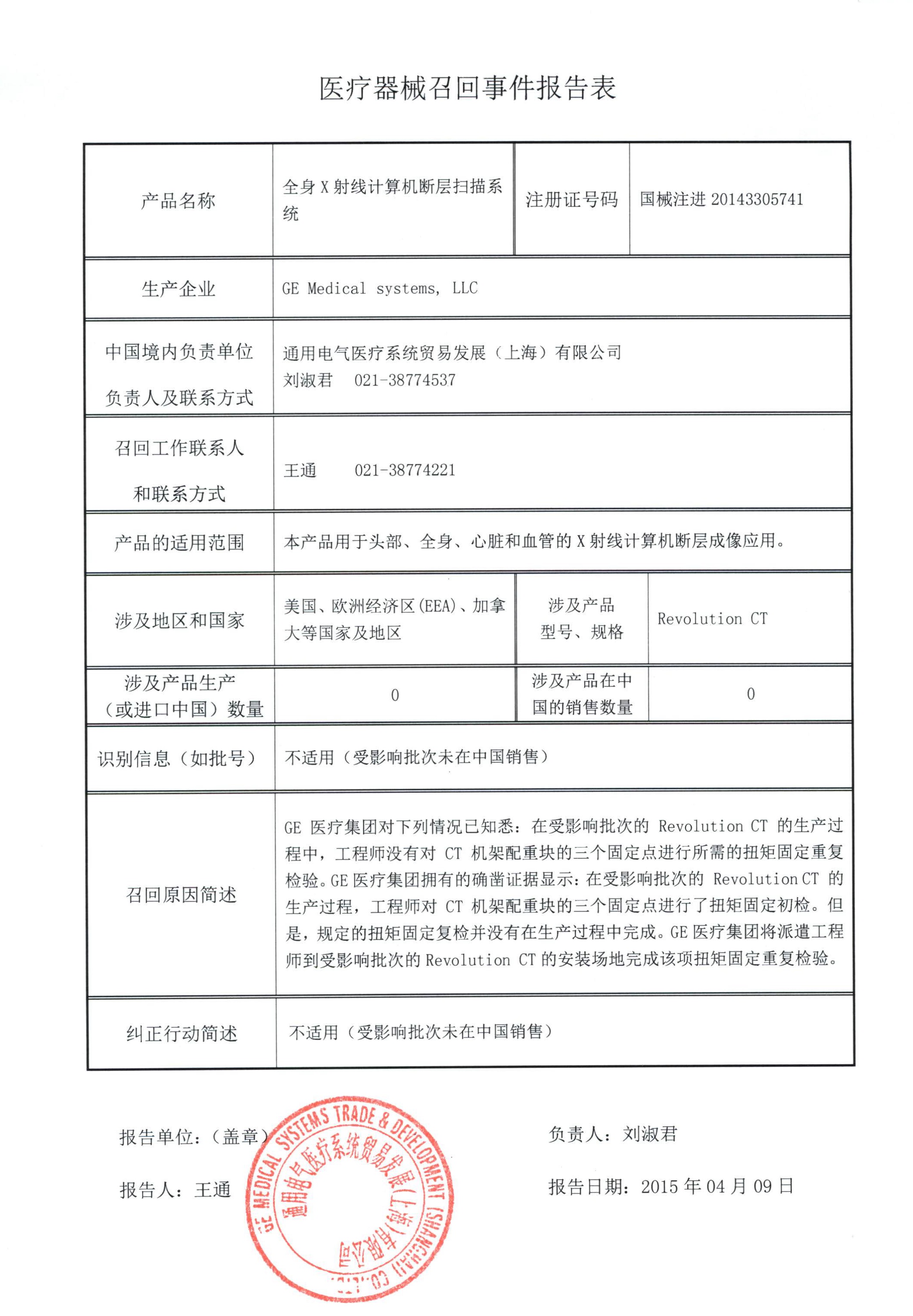 通用电气医疗系统贸易发展(上海)有限公司报告,该公司代理的全身X射线计算机断层扫描系统(注册证号:国械注进20143305741),由于工程师未对CT机架配重块的三个固定点进行所需的扭矩固定重复检验,生产商美国GE Medical systems, LLC对该产品进行主动召回。该公司称本次召回产品未在中国销售。请各省、自治区、直辖市食品药品监督管理局加强对此类产品的监督管理。