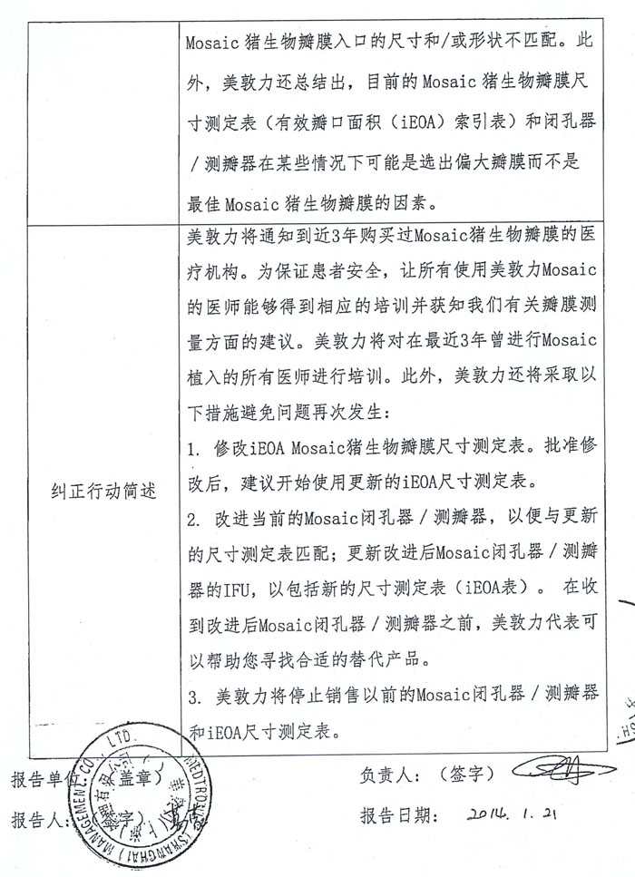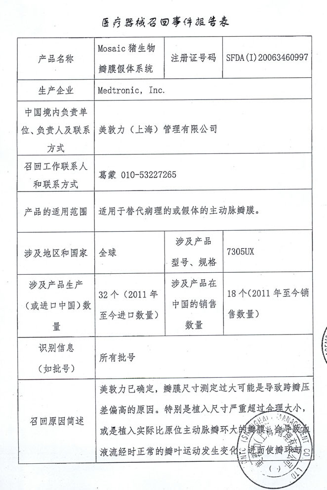 1月26日,收到美敦力(上海)管理有限公司报告,该公司代理的Mosaic猪生物瓣膜假体系统(注册号:国食药监械(进)字2006第3460997号)因瓣膜尺寸测定过大可能导致跨瓣压差偏高等原因,其生产商美国Medtronic, Inc.公司于1月21日对该产品进行主动召回。请各省、自治区、直辖市食品药品监督管理局加强对此类产品的监督管理。