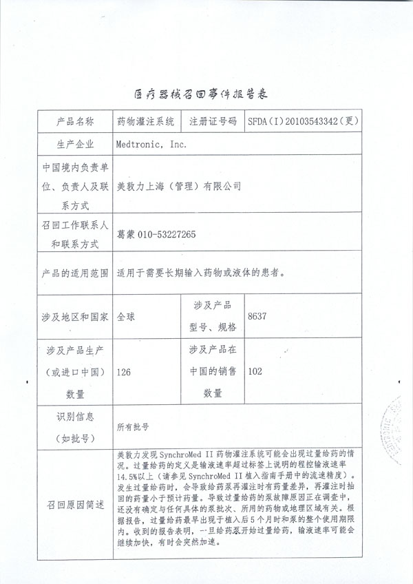 2014年3月28日上海市食品药品监督管理局报告,美敦力上海(管理)有限公司代理的药物灌注系统(注册证号:国食药监械(进)字2010第3543342号(更))因可能会出现过量给药的情况,其生产商美国Medtronic Inc.公司对该产品进行主动召回。请各省、自治区、直辖市食品药品监督管理局加强对此类产品的监督管理。