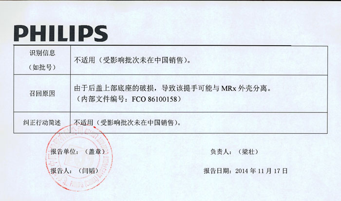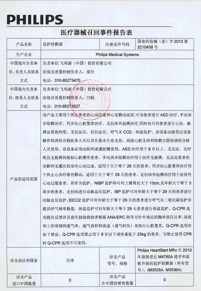 2014年11月20日收到飞利浦(中国)投资有限公司报告,该公司代理的护监除颤器(注册证号:国食药监械(进)字2013第3210458号)因产品后盖上部底座的破损,导致该提手可能与产品外壳分离,其生产商美国Philips Medical Systems公司对该产品进行主动召回。该公司称本次召回产品未在中国销售。请各省、自治区、直辖市食品药品监督管理局加强对此类产品的监督管理。(来源:国家食品药品监督管理总局网站)