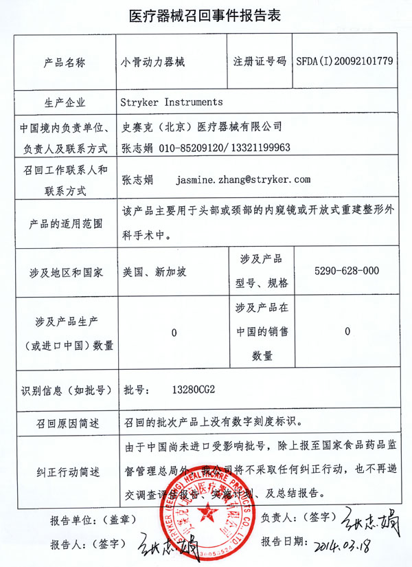 3月26日收到史塞克(北京)医疗器械有限公司报告,该公司代理的小骨动力器械 (注册号:国食药监械(进)字2009第2101779号)由于召回的批次产品上没有数字刻度标识,其生产商美国 Stryker Instruments公司对该产品进行主动召回。该公司称本次召回不涉及中国。请各省、自治区、直辖市食品药品监督管理局加强对此类产品的监督管理。