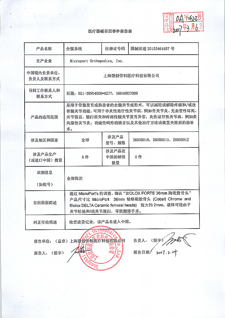 上海微创骨科医疗科技有限公司报告,该公司代理的全髋系统(注册证编号: 国械注进20153461657 ),发现“FORTE 36mm陶瓷股骨头”产品尺寸比MicroPort 36mm 钴铬钼股骨头(Cobalt Chrome and Biolox DELTA Ceramic femoral heads)短大约2mm,最终可能由于关节松弛和/或关节脱臼,导致翻修手术。其生产商MicroPort Orthopedics, Inc对该产品进行主动召回,该公司称本次召回产品未在中国销售。请各省、自治区、直辖市食品药品监督管理局加强对此类产品的监督管理。