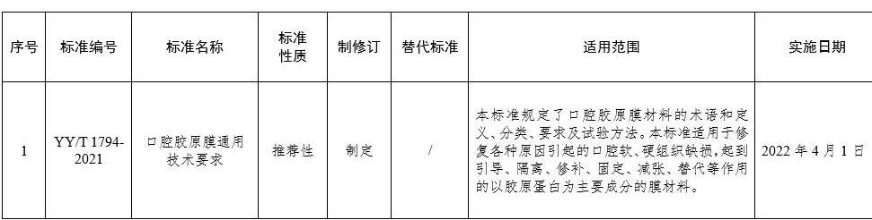 YY/T 1794-2021《口腔胶原膜通用技术要求》医疗器械行业标准已经审定通过,现予以公布。标准编号、名称、适用范围、实施日期见附件。