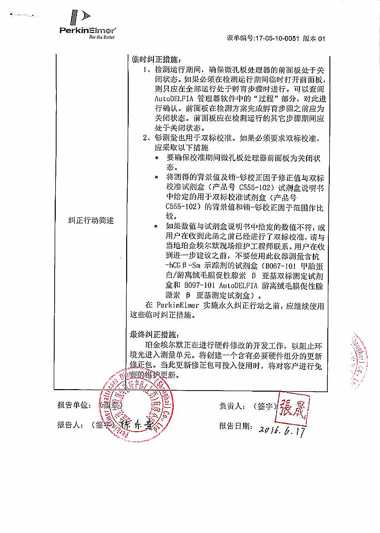珀金埃尔默医学诊断产品(上海)有限公司对全自动时间分辨荧光免疫分析系统主动召回