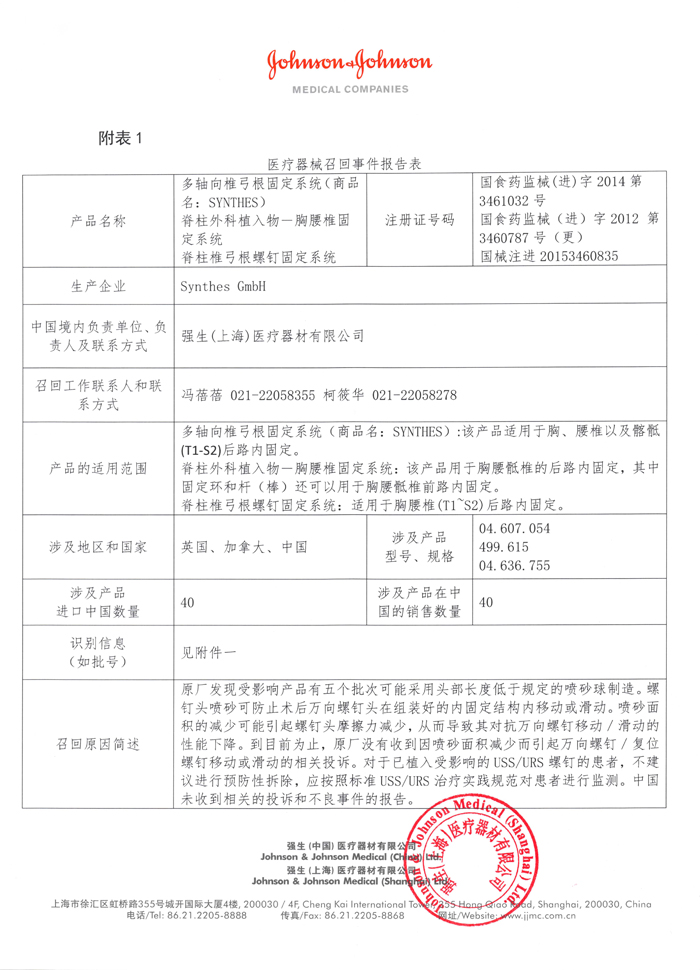 强生(上海)医疗器材有限公司报告:原厂发现受影响产品有五个批次可能采用头部长度低于规定的喷砂球制造。公司决定召回相关产品,本次召回级别为Ⅱ级,涉及产品的型号、规格及批次等详细信息见《医疗器械召回事件报告表》。
