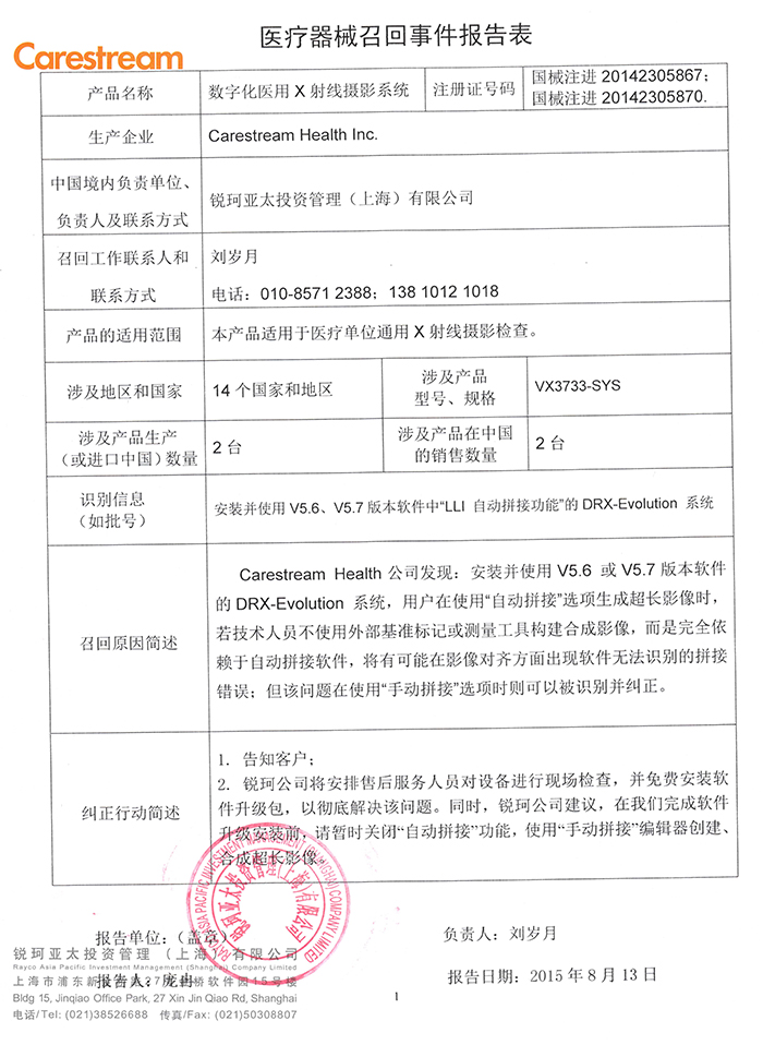 锐珂亚太投资管理(上海)有限公司对数字化医用X射线摄影系统主动召回