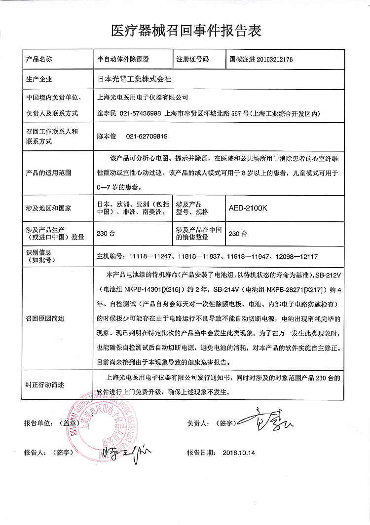 上海光电医用电子仪器有限公司对半自动体外除颤器主动召回
