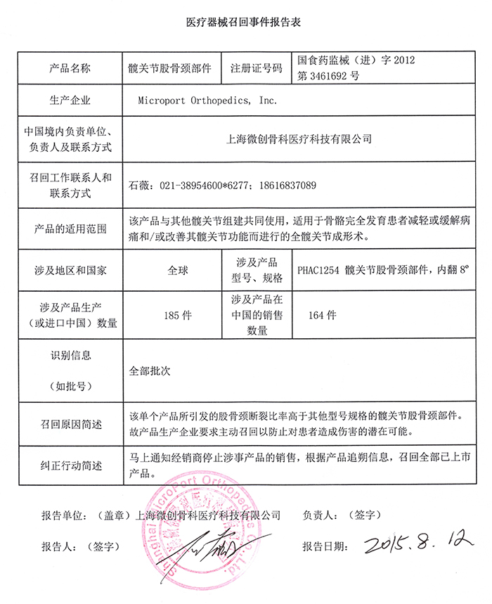 上海微创骨科医疗科技有限公司对髋关节骨颈部件主动召回